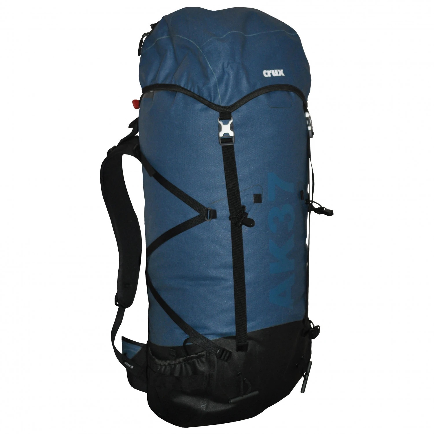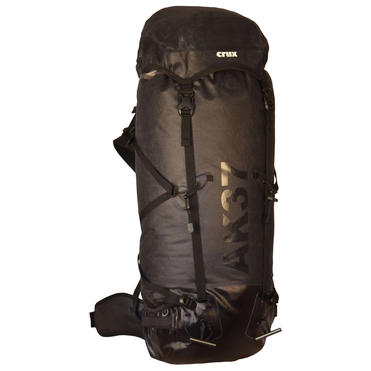 Der AK37 von Crux ist auf lange Tage mit technischen Routen im Gebirge ausgelegt. Der Toploader besitzt getapte Nähte und eine TPU-Beschichtung, welche gemeinsam mit dem Rollverschluss dafür sorgt, dass der Inhalt perfekt gegen Regen und Feuchtigkeit geschützt ist. Der verwendete Materialmix aus Polyamid und Aramid ist extrem robust und abriebfest – so können ihm schroffe Felswände und das Abstellen auf scharfkantigen Untergründen nur wenig anhaben. Dank des leichten Titanrahmens wird eine hervorragende Lastverteilung generiert, welche auch bei voller Beladung für einen guten Tragekomfort sorgt. So kann selbst das Equipment für Mehrseillängen über weite Strecken geschultert werden.