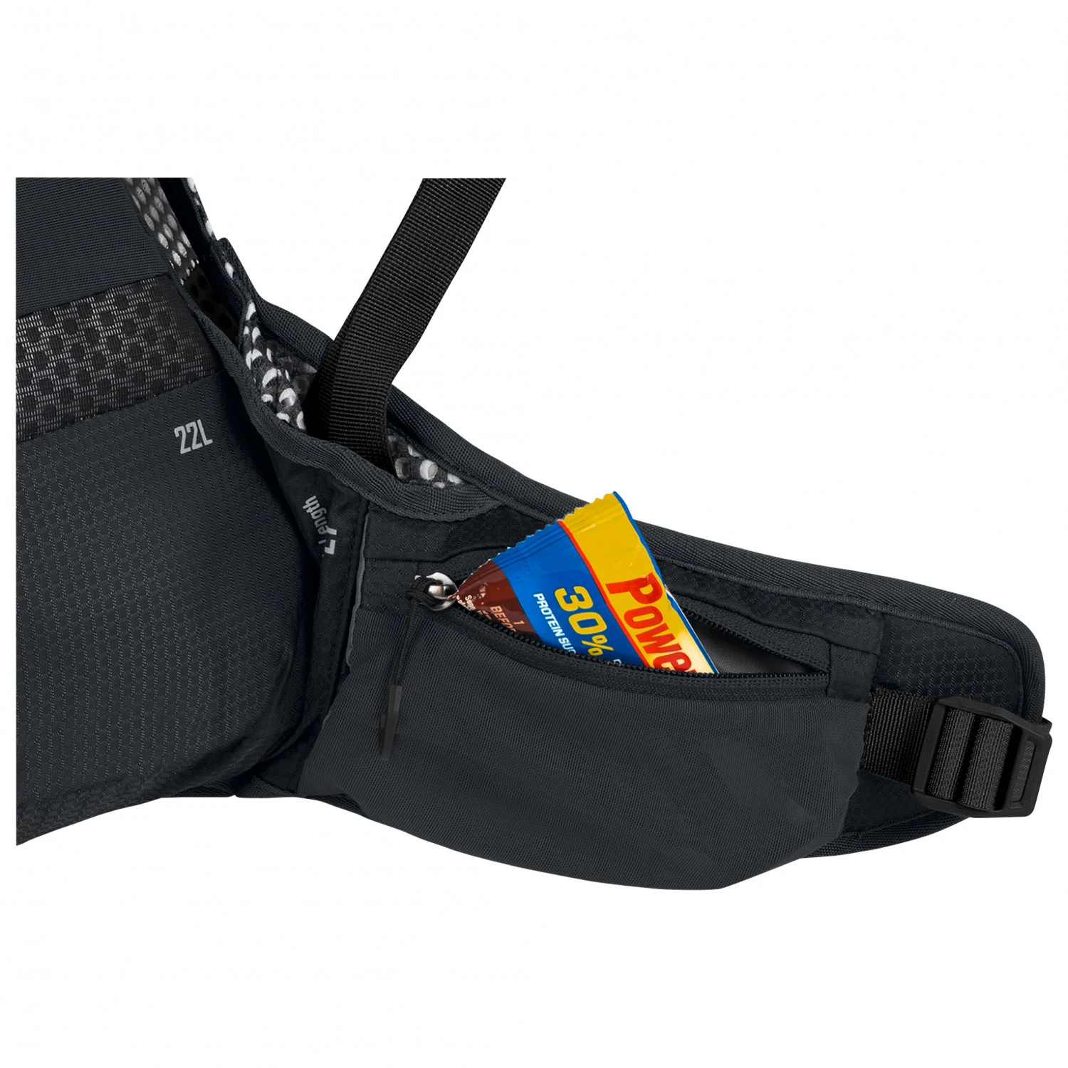 In einem Hauptfach lässt sich nötiges Gepäck und Proviant für den Tag verstauen. Zudem können in weiteren Außentaschen sowie zwei Taschen am Hüftgurt schnell zu erreichende Utensilien verstaut werden. Für lange Touren kann der Rucksack mit einem Trinksystem kombiniert werden, sodass Du nicht dehydrierst. Solltest Du in einen überraschenden Regenschauer gelangen, dann lässt sich der integrierte Regenschutz schnell über den Rucksack ziehen.