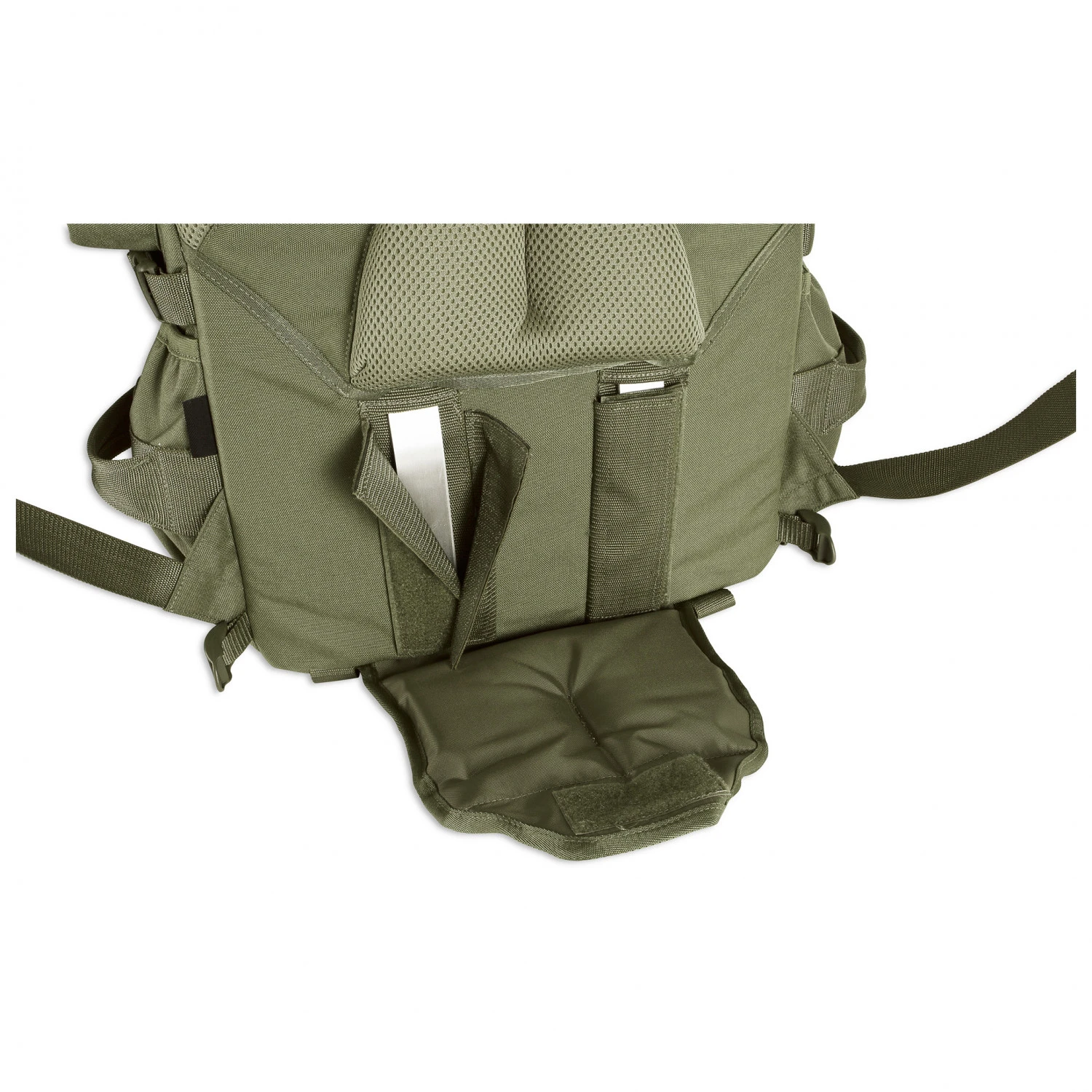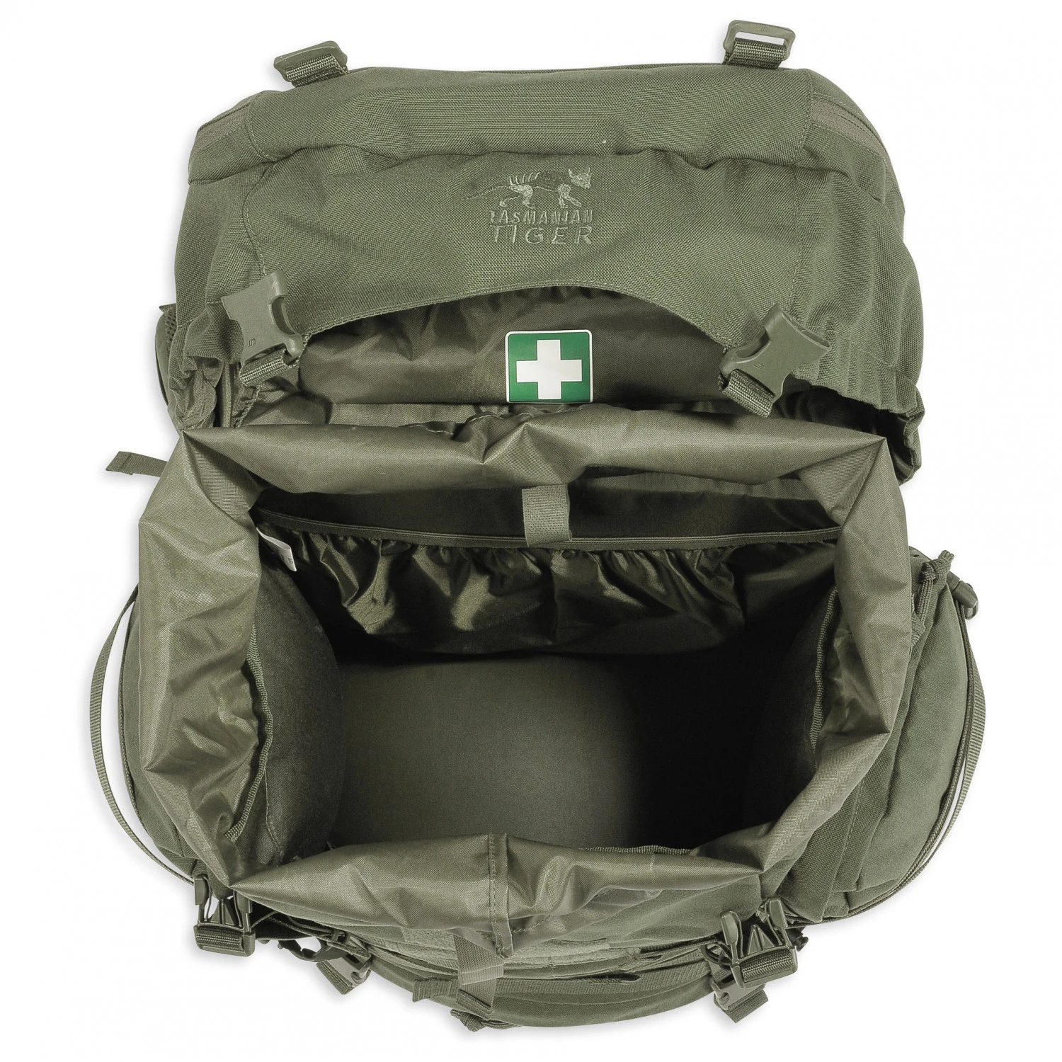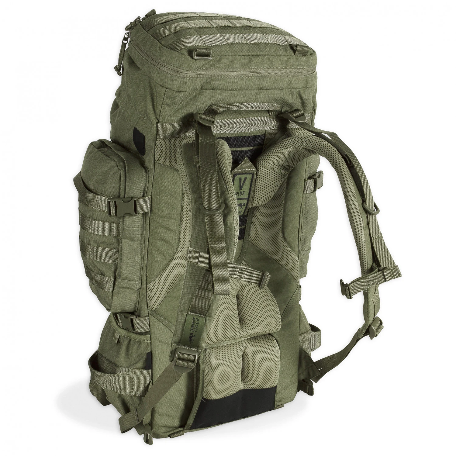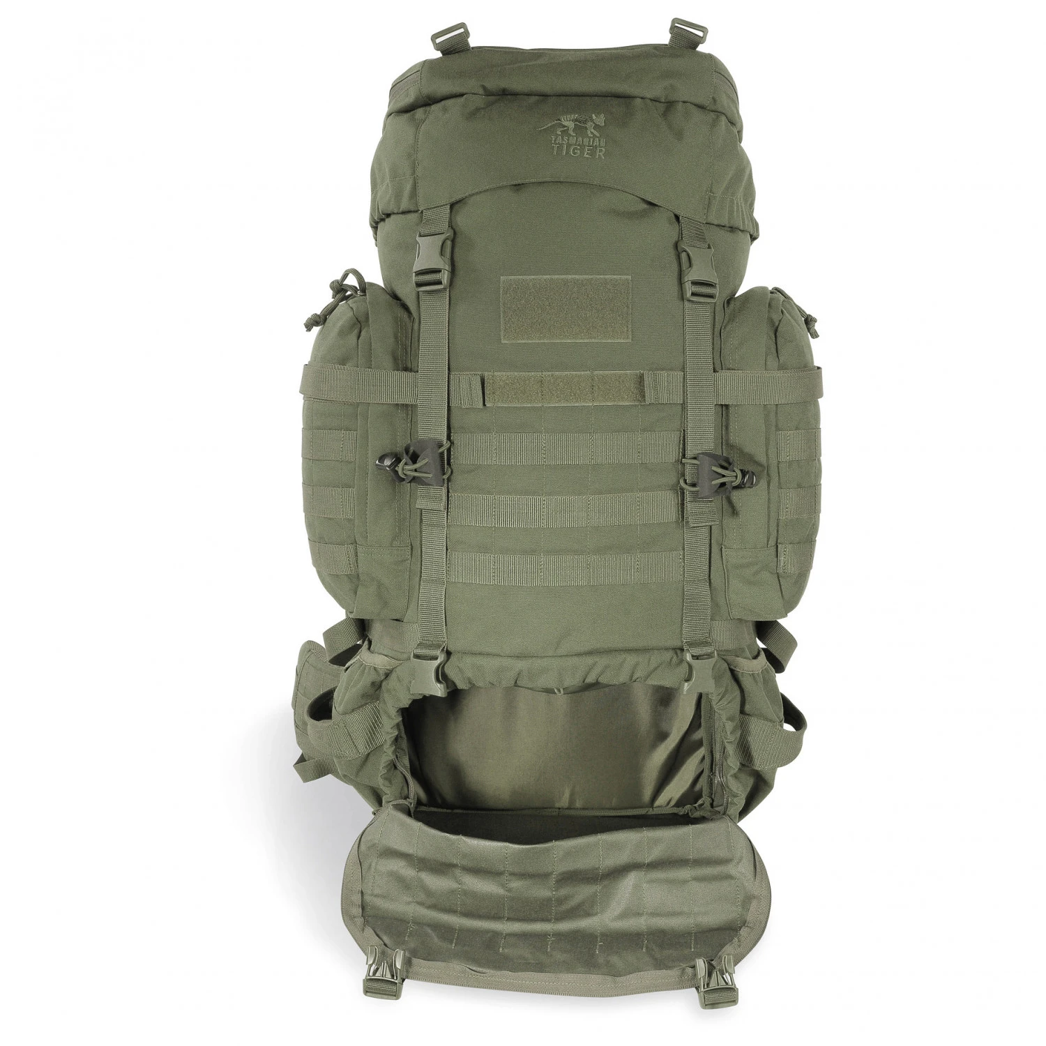 Er besteht aus einem geräumigen Hauptfach, einem Deckelfach mit Materialschlaufen und weiteren Außentaschen. So hat man eine übersichtliche Ordnung und Dinge schnell griffbereit. Antennenausgänge im Hauptfach sind praktisch für das Funkgerät. Seine Eisgeräte oder Trekkingstöcke bringt man außen am Rucksack an. Dank Molle-System lässt sich der Rucksack individuell erweitern. Materialschlaufen ergänzen ihn optimal. Kompressionsriemen reduzieren bei Bedarf das Volumen.