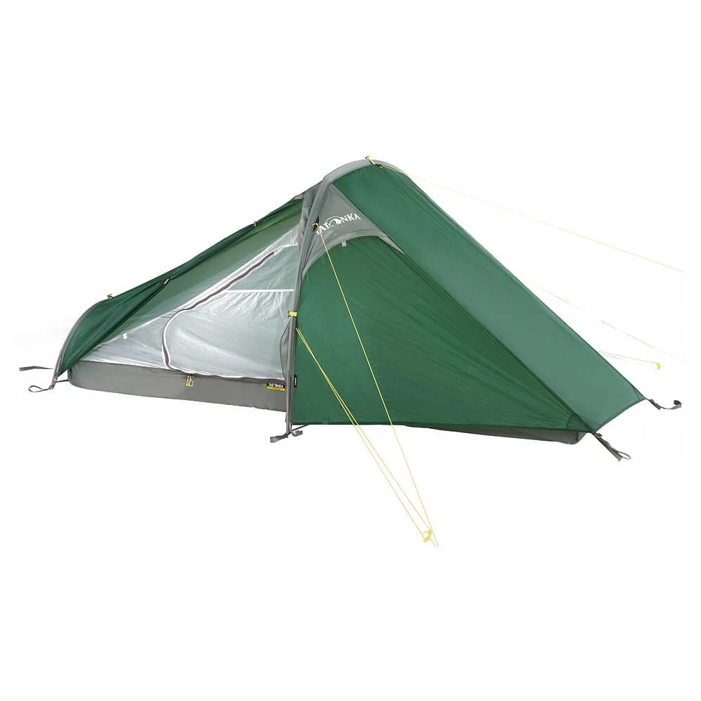 Das Kyrkja 1 Personenzelt von Tatonka ist eine sehr leichte und klein packbare Camping- und Trekking-Solotouren-Unterkunft. Das Tunnelzelt mit Seiteneingang und Apside hat einen zweiten Gestängebogen, der es auch langen Outdoorern ermöglicht, ausgestreckt zu schlafen. Das Kyrkja ist mit seinem ultraleichten Scandium Gestänge schnell und einfach aufgebaut, da Innen- und Außenzelt miteinander gekoppelt sind. Verstärkte Eckpunkte mit Gurtbandschlaufen sorgen dabei für Stabilität und Haltbarkeit. Sollte es beim Abbau regnen, lässt sich das Innenzelt auch aushängen und trocken verstauen. Beim nächsten Aufbau wird dann zunächst das Außenzelt aufgestellt und anschließend das trockene Innenzelt eingehängt.Für angenehm trockenes Innenklima sorgt das Außenzelt aus äußerst reißfestem, 5-fach silikonbeschichtetem Nylon 6.6 Ripstop-Gewebe. Der wasserdichte Zeltboden aus PU-beschichtetem Nylon schützt mit einer Wassersäule von 10.000 mm optimal vor Nässe von unten. Das Innenzelt sorgt mit einem Lüfter für ausreichend Ventilation. Da die Apsis genug Platz für den Trekkingrucksack und andere Ausrüstung bietet, kann man es sich drinnen durchaus gemütlich machen. Die integrierte Wäscheleine im Innenraum sorgt für trockene Socken und hilft beim Ordnung halten. Wer Gewicht und Packmaß minimal halten will, ohne auf verlässliche Robustheit zu verzichten, ist mit dem Kyrkja 1 Personen Zelt von Tatonka bestens versorgt!